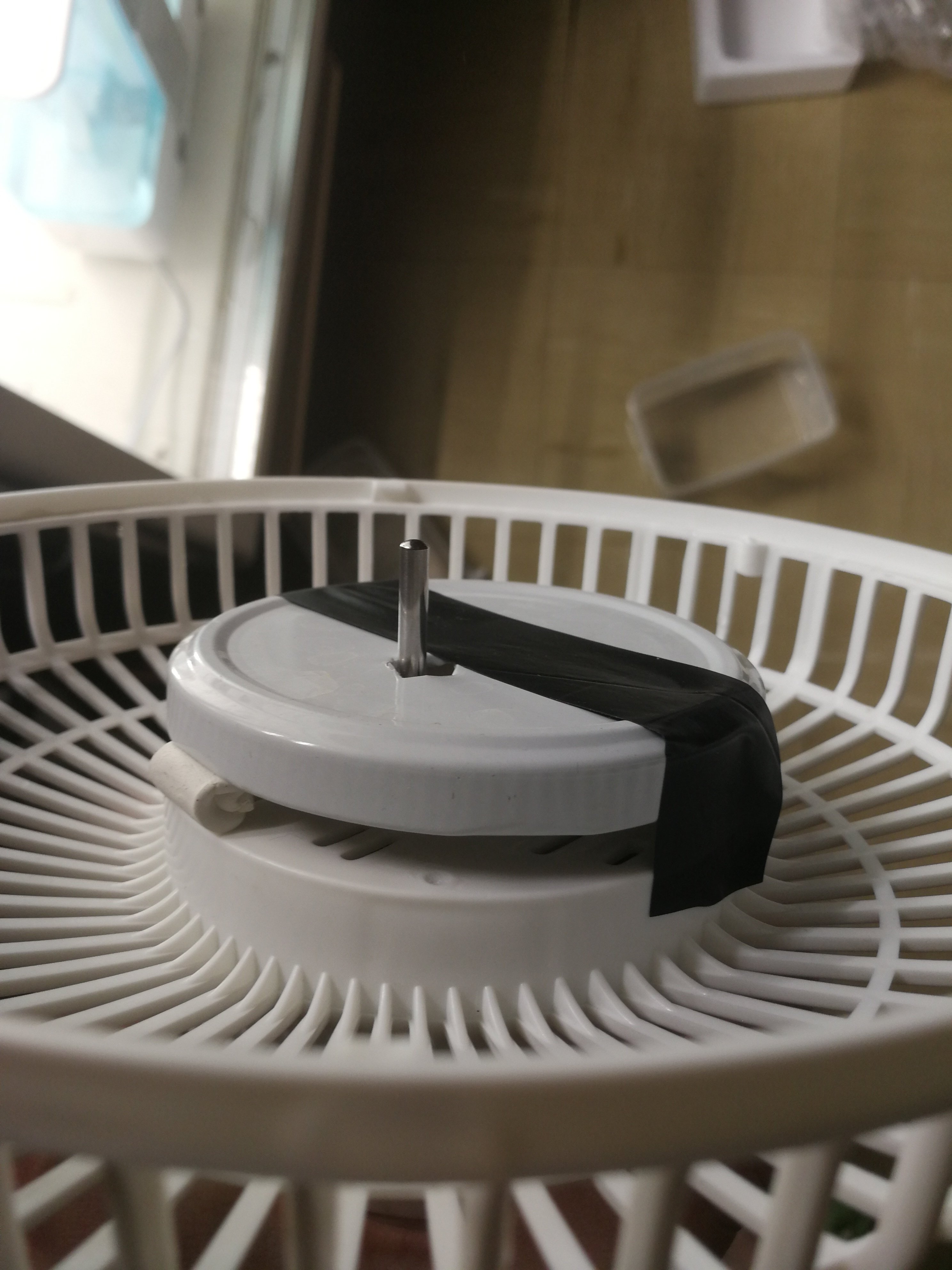 However, it seemed to stop working properly. The next day my hygrometers at the top and middle registered humidities in the 60-70% range, which was quite normal for the Mooskubator. The humidifier itself was stuck at +90% RH. I suspected the moist air from the bottom had trouble reaching the top. So, I went out to find a small ventilator, and I got one for 5 Euros at a local electronics chain. I "freed" it from its stand and put it above the humidifier. When both were running the mist was evenly distributed in the fridge. I waited for an hour while regularly checking the various thermometers and hygrometers. The temperatures started to match each other, the humidity started to sink, but the humidifier stayed at 91%. Now I suspected something was wrong with it, so I took it out and disassembled it. Well, it was basically soaking with water. The air intake was routed through a pan meant to hold essential oils, which had a sponge full of water. No surprise the hygrometer was “stuck” at such a high value. I rectified the issue by removing the pan and baseplate to improve ventilation. Some electrical tape protects the electrical bits, and lids made for perfect stand-offs. When put it back into the Mooskubator it started working like I wanted it to. Humidity dropped, it started misting until a set value was reached, then stopped. All fine right? No. How the fan was set up allowed water to drop through the ventilation slits onto the electrical parts. To rectify this, I first contemplated ways to reverse the airflow, so I could invert the fan. However, then the mist would get pushed through the motor compartment. I decided on botching blinds: using tape, lids and a kind of adhesive dough the slits were covered in a way still allowing air to pass through.