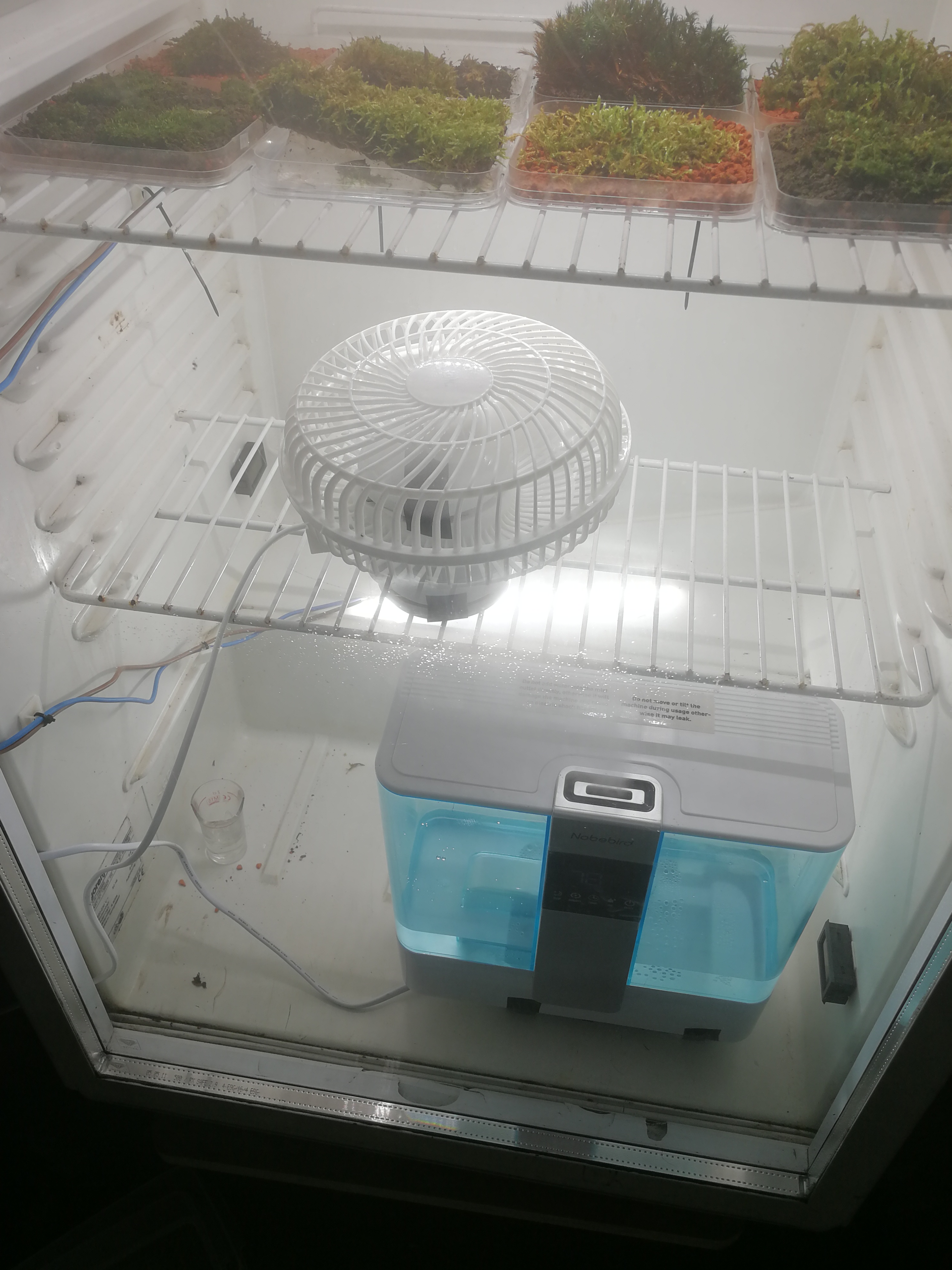 As written in my first blog post, I wanted to tackle the problem of frequent desiccation of my cultures. I put it off for some time, since I seem to be bad at finding the stuff I want for an affordable price online. I needed a humidifier which either started misting when it was powered or had a built-in humidistat. Both allow an easy way for automating humidity control. I tried finding such a device several times on amazon, but no luck. About a week ago, I asked a good friend of mine to find one for me, and he needed less than 15min for it. The device with humidistat arrived two days later and went straight into my Mooskubator and started misting. As you can see on the following picture, it is quite enthusiastic.