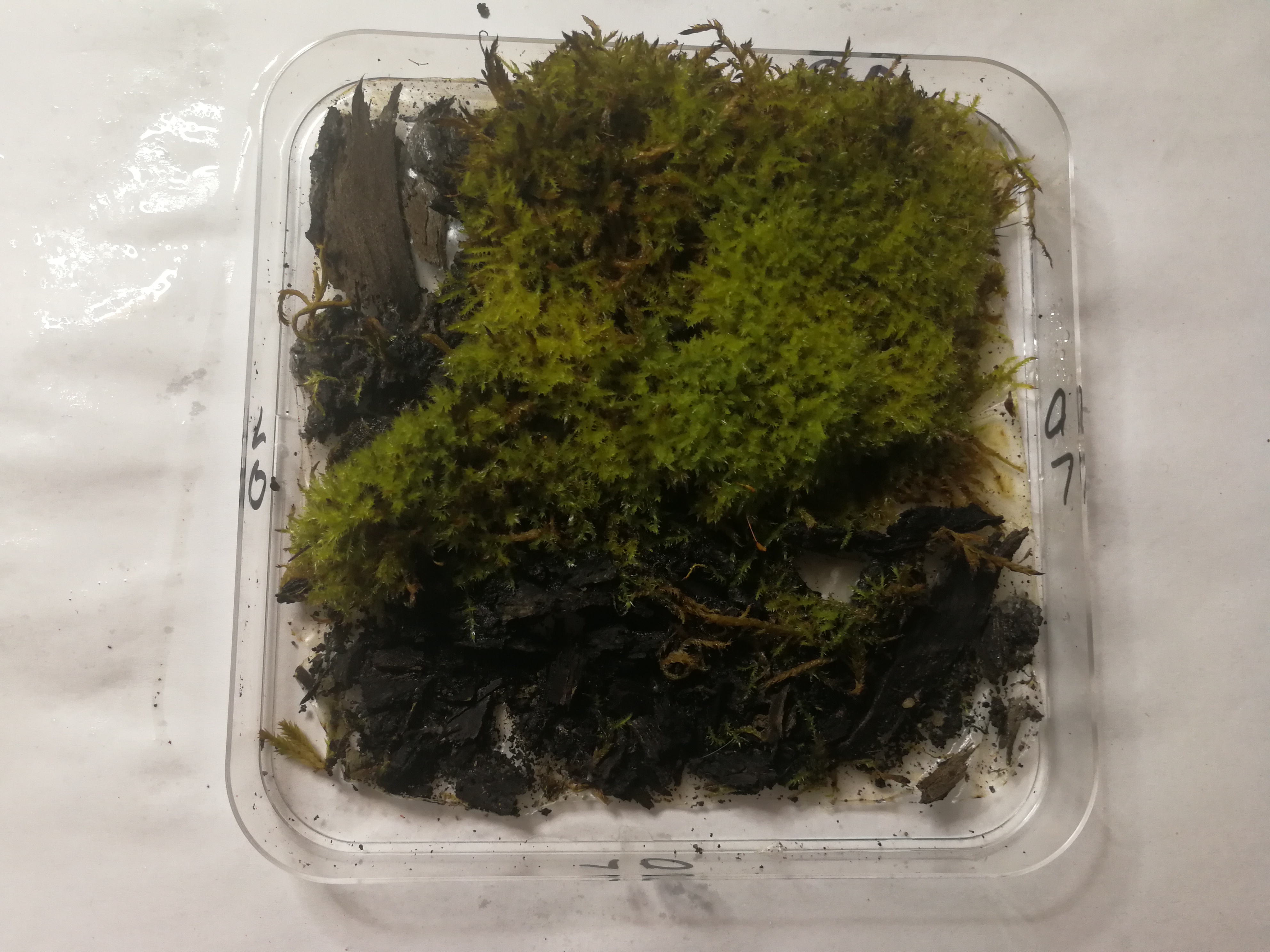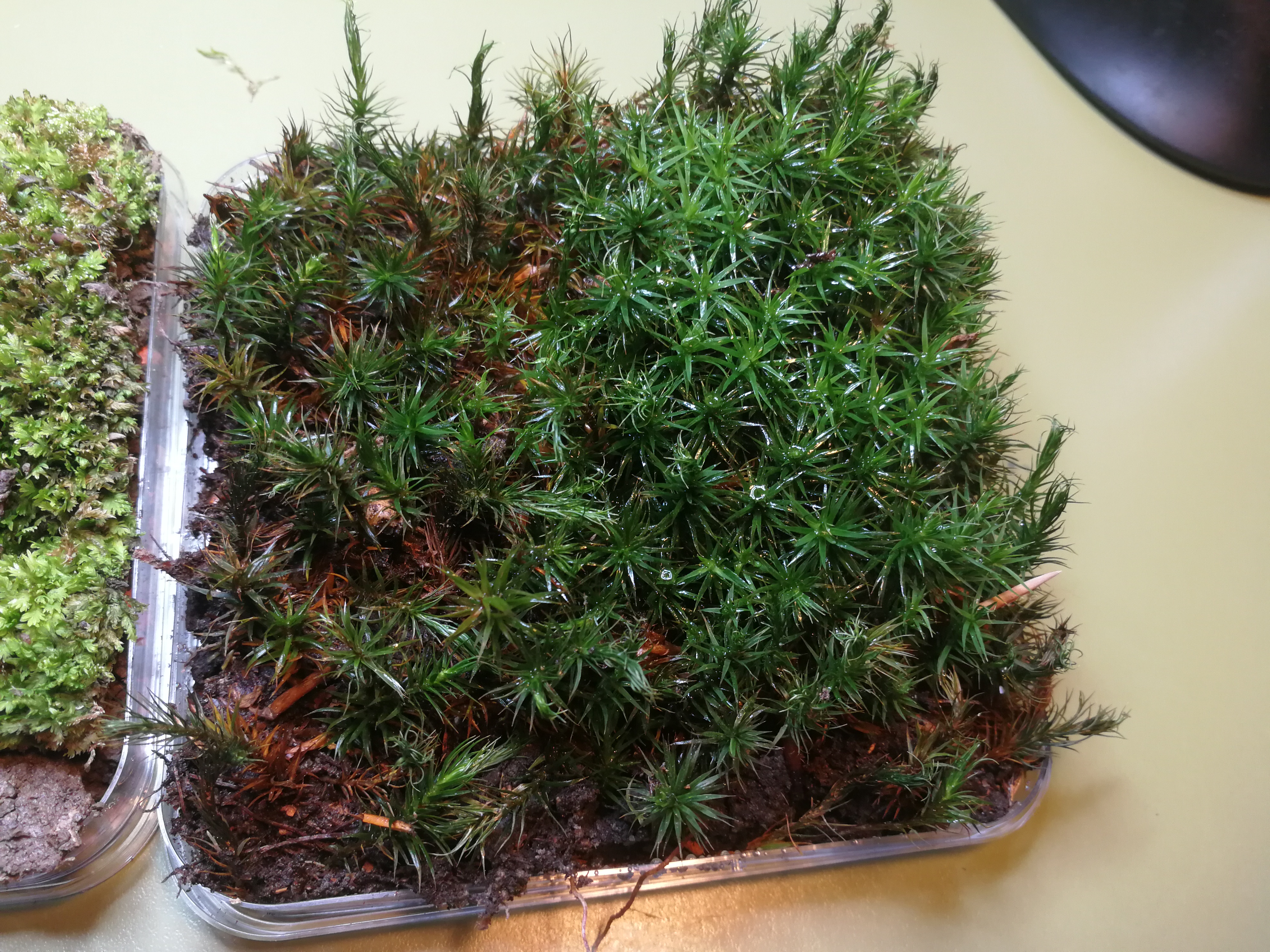Since I had to leave my cultures unattended for some time it was necessary to conduct maintenance. Thankfully bryophytes are quite hardy when it comes to desiccation, no culture died. Besides watering a handful of cultures were reduced in size: dead or nearly dead gametophytes where removed to give more space for healthy ones. This was conducted quite radical as the following "before"/after pictures of my Polytrichum sp. culture demonstrate: